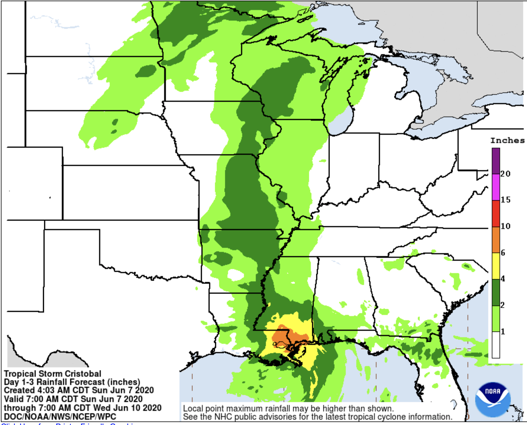 Because Cristobal is not expected to stall along the coast, the potential for flooding is much lower. The Weather Prediction Center is calling for between 6” and 10” of rain from New Orleans over to Mobile. That same area also has the potential for some storm surge flooding.