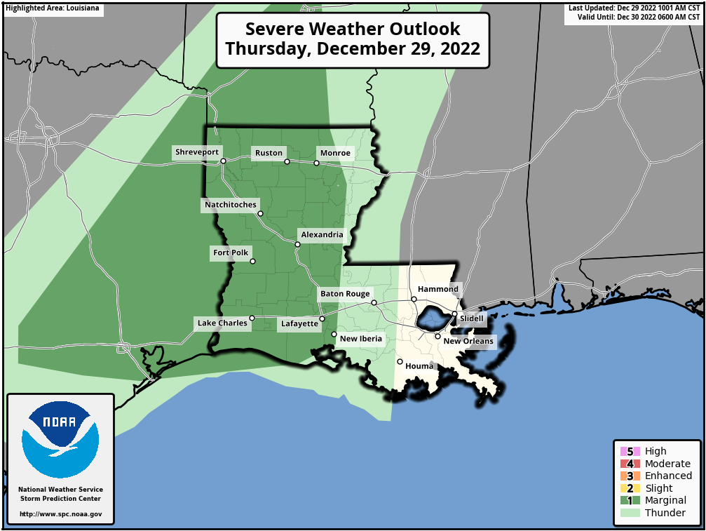 Radar out of Shreveport shows ongoing showers and embedded thunderstorms moving from SW to NE across East Texas and Louisiana. The Storm Prediction Center has the area highlighted in a Marginal Risk (1 out of 5) for a few stronger storms today. There’s a small chance of a tornado, hail, and wind, but I think the more likely threat today and tonight will be the chance of flash flooding from heavy rain.