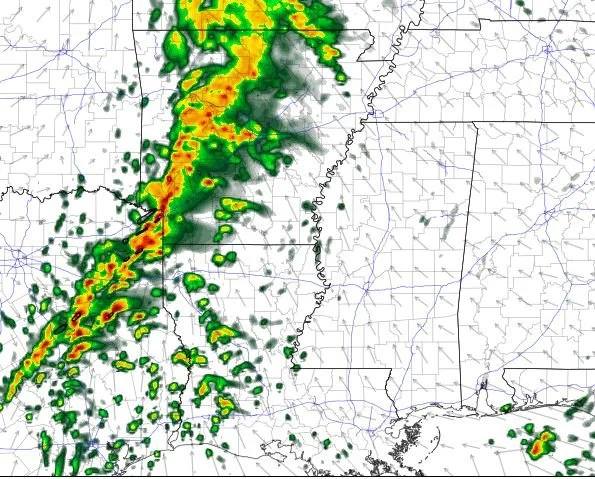 By 10pm, storms are pushing away from the ArkLaTex and impacting the ArkLaMiss Region. Notice the broken line of storms ahead of the main line. This broken line from Lake Providence, LA to Monroe and down to just east of Alexandria will pose a tornado threat. The main line could also produce spin-up tornadoes, but damaging winds would be more likely.