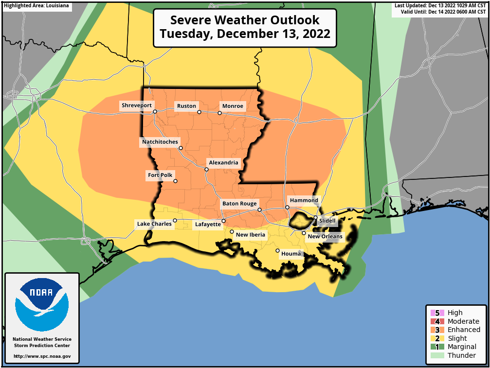 An Enhanced Risk (3/5) for severe weather for areas shaded in orange from E TX to Central MS which includes much of LA.