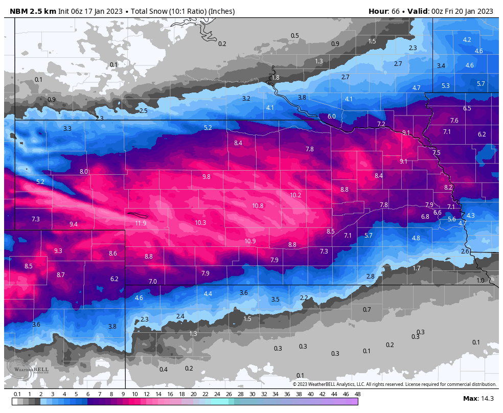 National Blend of Models Snowfall Forecast: 4 - 7” across the Omaha Metro