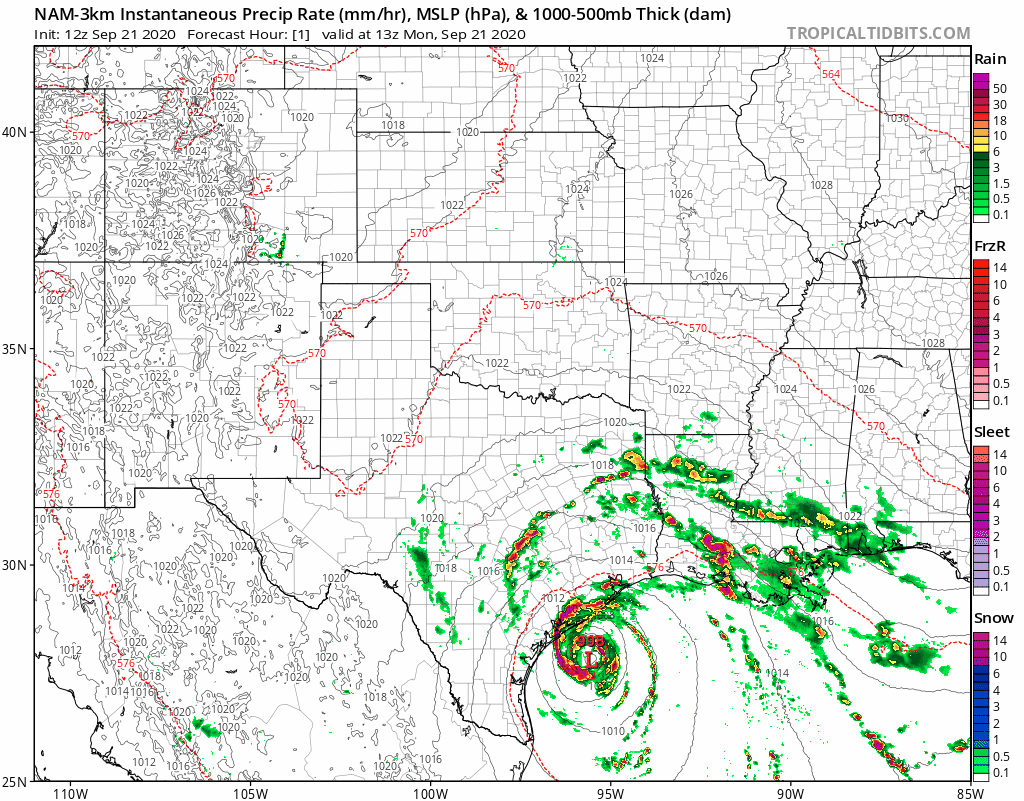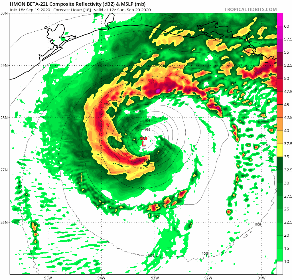 This GIF above is the HWRF tropical model. Notice it takes the center of the storm right over Corpus Christi, TX, but then bounces Beta back out to sea. That bounce may be a little overdone, but the idea has merit. Beta has a real problem after making landfall. Several of the models take the upper level center of rotation off towards the northeast, but the lower surface level rotation gets stuck by a surface high in Central Texas. It should eventually turn towards the Lake Charles area as a Tropical Depression, or maybe a weak Tropical Storm by late next week. But, that separation from the lower and upper level rotations will prevent the storm from getting stronger.