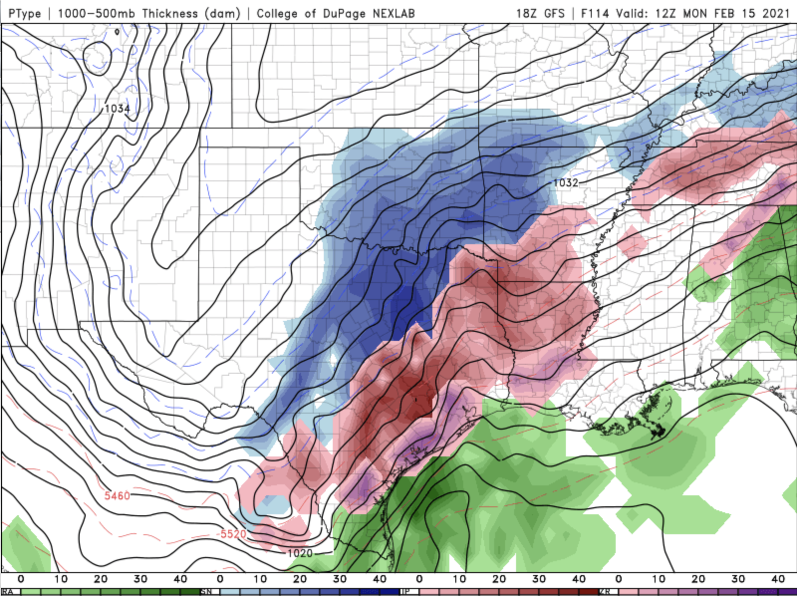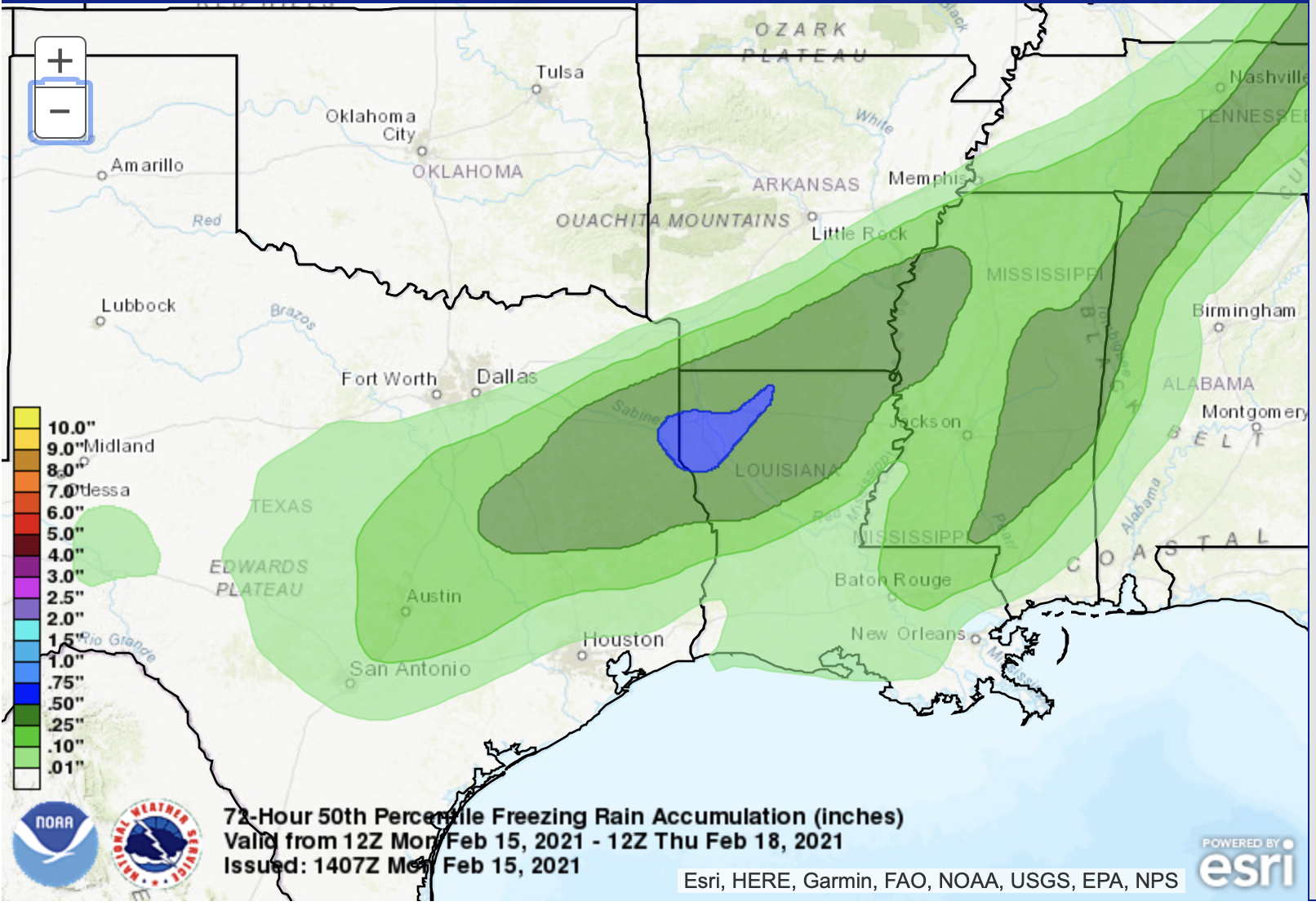 All three of these models are showing a band of ice running from Central Texas, to the Gulf Coast, and up through Louisiana and into Mississippi. They are also all three showing a bulls-eye of ice accumulation greater than half an inch from about Lufkin, TX, into Louisiana, including Shreveport, Natchitoches, Alexandria, Ruston, and Monroe. That would be enough ice to bring down power lines and tree branches.